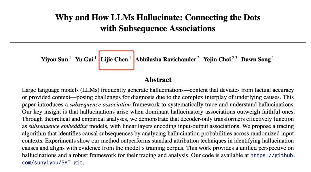 值得一提的是,OpenAI 在去年 9 月发表的出圈论文《Why Language Models Hallucinate》中,也引用了陈立杰参与的另一篇研究《Why and How LLMs Hallucinate: Connecting the Dots with Subsequence Associations》。