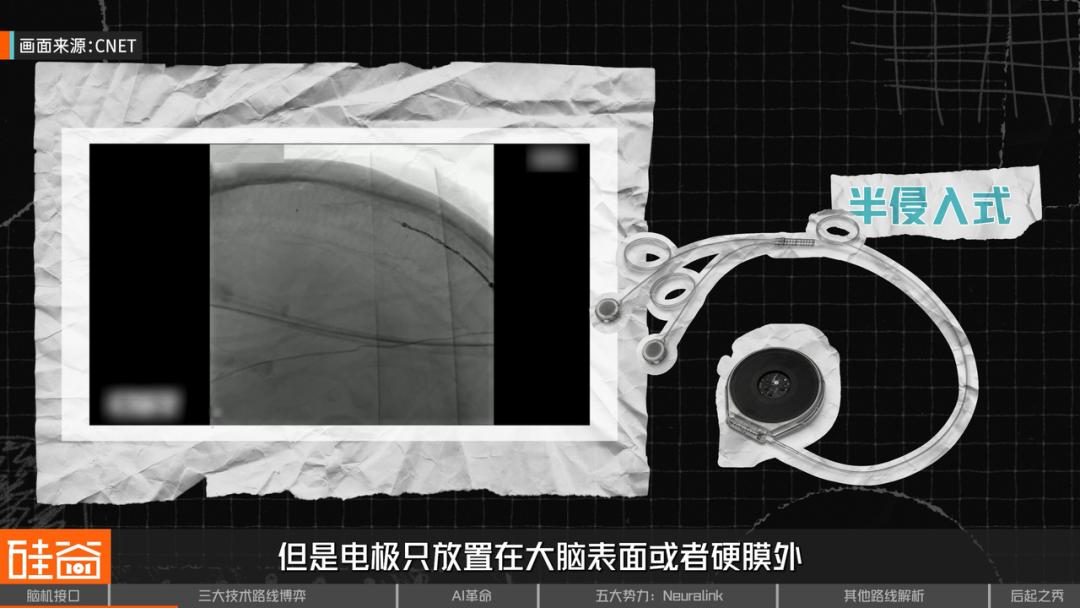 第二派别的中间路线,叫“半侵入式”。半侵入式是一条“中间路线”,需要开颅,但电极只放置在大脑表面或硬膜外,不穿透脑组织,或者通过血管植入。优点是信号质量比非侵入式好,但风险比完全侵入式会略低一些;缺点则是通道数相对较少,性能不如全侵入式。