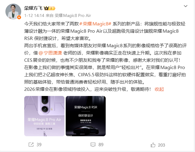 就在发布会官宣的 1 月 12 日,荣耀产品线总裁方飞在社交媒体上对荣耀 Magic8 RSR 保时捷设计的影像理念进行了解读。他表示,在影像上荣耀做的事情其实很简单,核心就是帮用户“轻松出片”。这个理念看似简单朴素,背后却是极其复杂的软硬件工程。方飞透露,在荣耀 Magic8 Pro 上,团队通过将 2 亿超夜神长焦、CIPA 防抖等软硬件配置做实,着重打磨拍照的基础体验,只为带给普通消费者轻松好用、随手出片的体验。这种对用户体验的极致关注,也获得了业界的认可。方飞提到,在 CES 展会期间,不少国际友人都对荣耀的影像表现给予了高度评价,媒体朋友也认为荣耀影像正走在快速上升期。