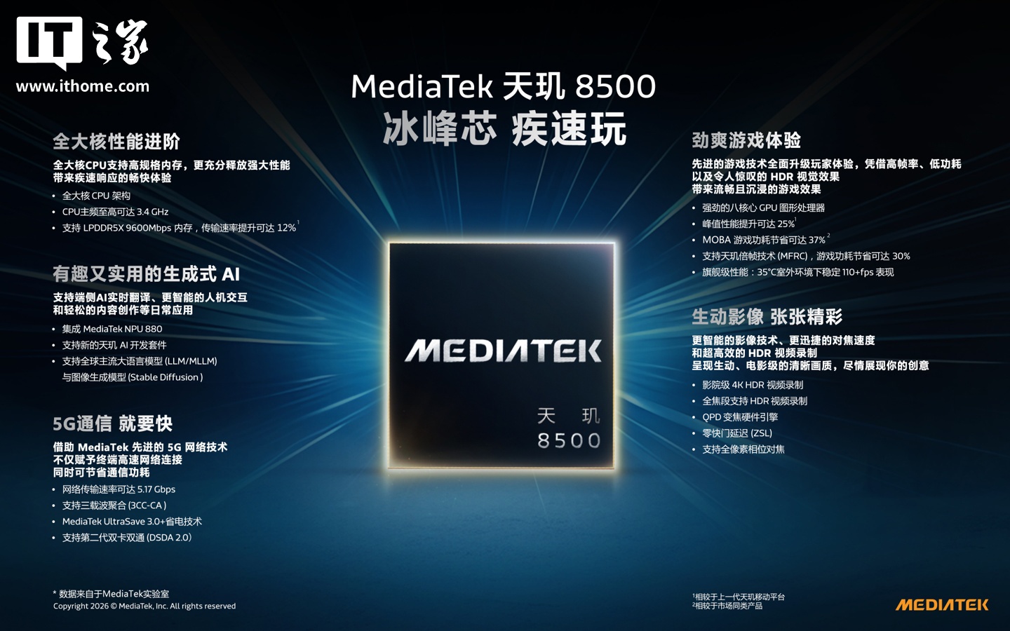 IT之家 1 月 15 日消息,2026 联发科天玑芯片新品发布会正在举行,首先带来的是天玑 8500 芯片。