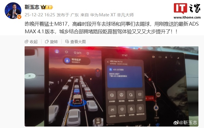 据IT之家此前报道,华为智能汽车解决方案 BU CEO 靳玉志在去年 12 月 22 日发布视频,首曝了华为乾崑智驾 ADS MAX 4.1 版本,称自己开着猛士 M817 在高峰时段去球场和同事们去踢球,用的就是最新 ADS MAX 4.1 版本。据其透露,新版本的城乡结合部拥堵路段智驾体验“又又又大步提升”。