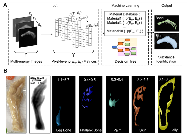 图1,(A)多能X射线成像及智能物质识别系统的工作原理图;(B)该系统对鸡爪的成像与生物组织识别结果。