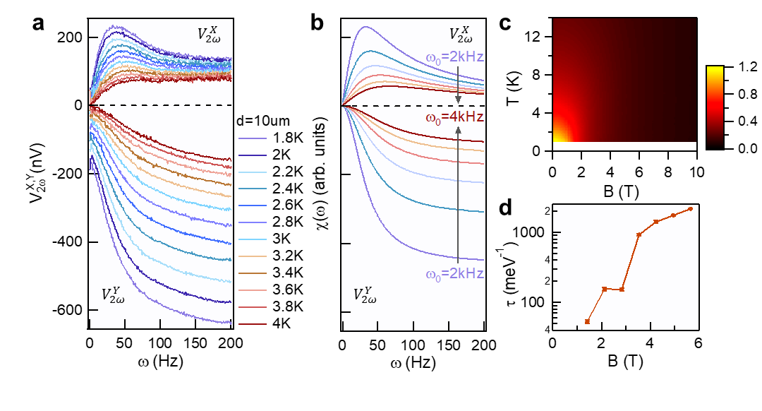 图3(a)不同温度下2ωX和2ωY随激发频率的变化图(b)过阻尼受迫振子响应的实部和虚部的理论模拟(c)蒙特卡罗计算磁化率的B-T相图(d)2K温度下蒙特卡罗模拟磁振子寿命随磁场的变化