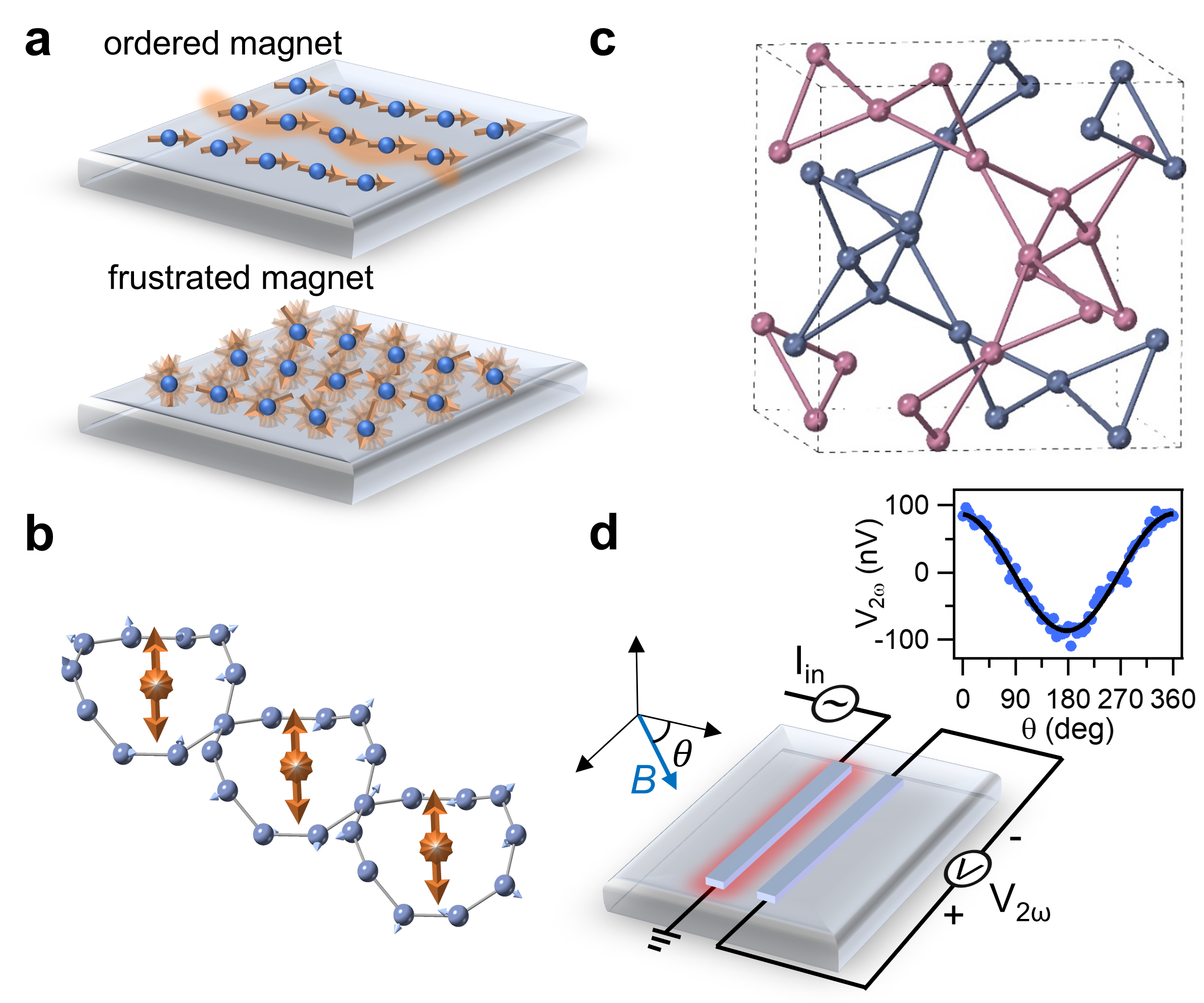 图1(a)磁有序体系中的自旋波示意图和磁阻挫体系中的自旋涨落示意图(b)GGG中由Gd3+的十自旋环形成的长程指向态示意图。橙色双头箭头表示与自旋环平面垂直的指向矢,较小的灰色箭头表示局域磁矩(c)仅显示了Gd原子的GGG晶体结构,两套子格子分别用灰色和粉色表示(d)非局域自旋输运测量器件示意图。在GGG衬底上沉积两根Pt电极,一根通过热激发注入自旋流,另一根通过逆自旋霍尔效应检测自旋信号