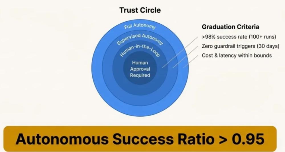 团队召开会议,审查预防指标,并讨论推进自主边界——根据经验证据,推动从人机交互到完全自主执行的具体行动。