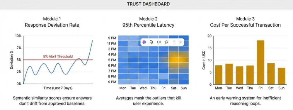 响应偏差率 :跟踪与已批准答案基线的语义相似度(警报阈值 >5%)。