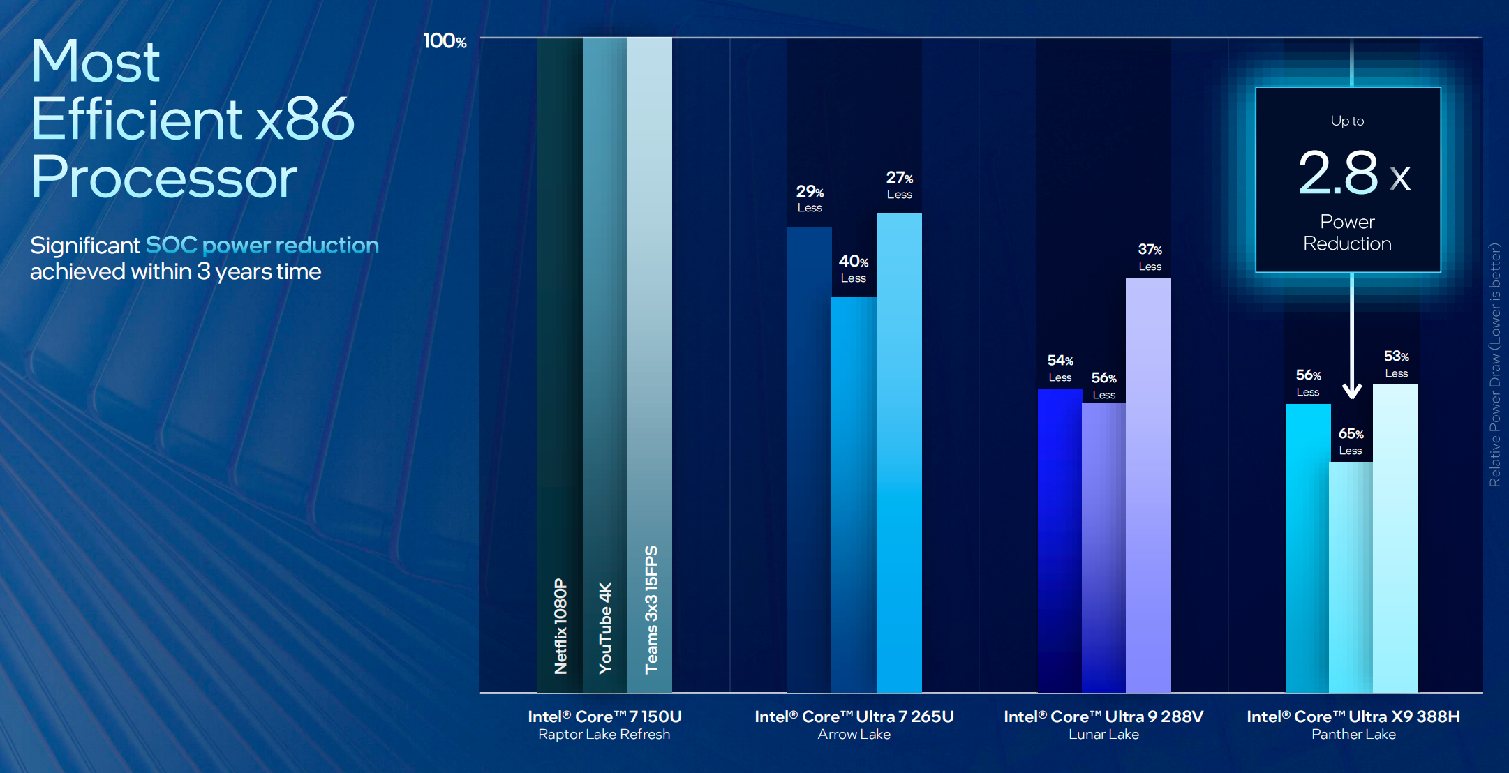 Panther Lake的能效表现提升也十分显著。从实测数据看,在同样性能下,相比前代Lunar Lake和Arrow Lake,功耗降低近40%。这种能效提升直接转化为了用户可感知的续航突破──第三代酷睿Ultra实现了长达27小时的多日电池续航。