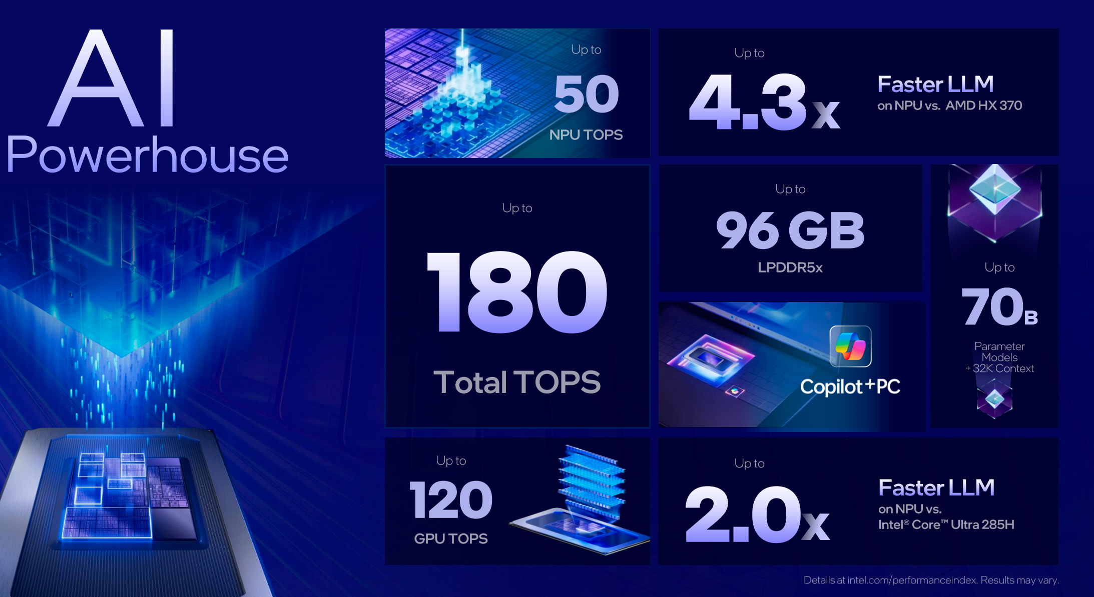 此外,Panther Lake搭载算力达50 TOPS的低功耗NPU,其大语言模型推理性能较上一代提升2倍,相比竞争对手具有4.3倍优势。该NPU支持持续推理与始终在线任务,适合视频会议与安全防护等场景。