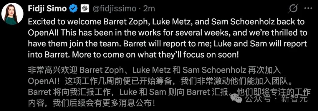 在Mira发布声明后的不到一小时,Simo便发帖欢迎Barret Zoph、Luke Metz和Sam Schoenholz的回归。