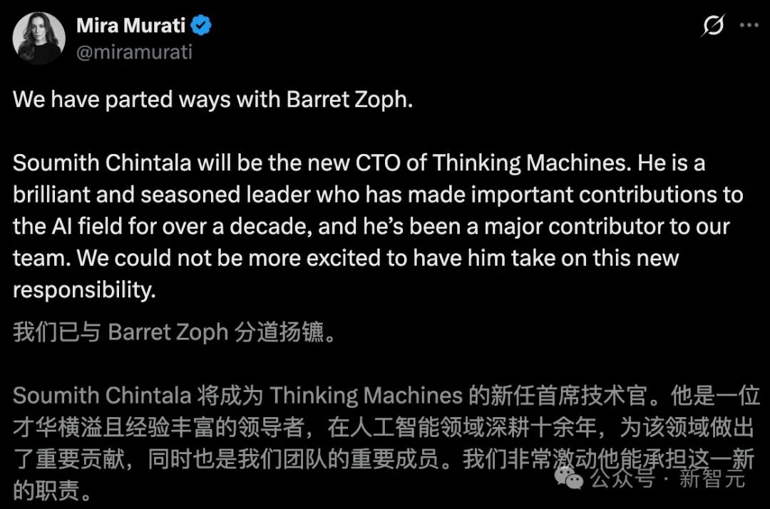 这次「分手」,Mira好像并没打算给Barret Zoph这位联合创始人留面子。