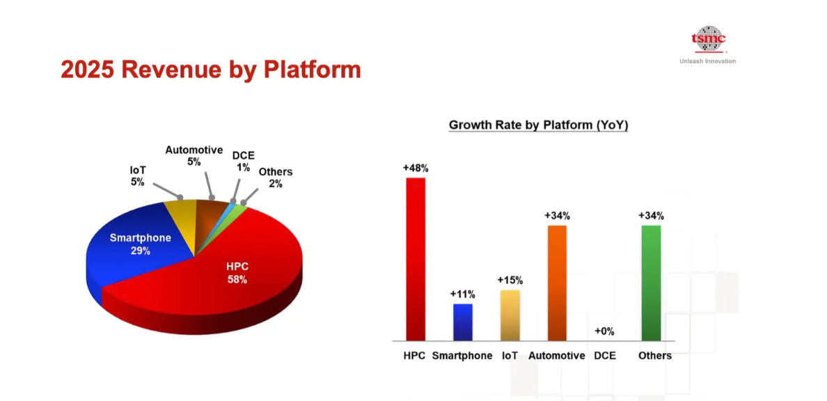 然而,当台积电本周发布财报时,智能手机业务已明显不再是其最重要的板块。台积电高性能计算业务主要为英伟达和大规模云服务提供商制造AI芯片,现在约占台积电收入的58%,远超智能手机处理器业务的29%。