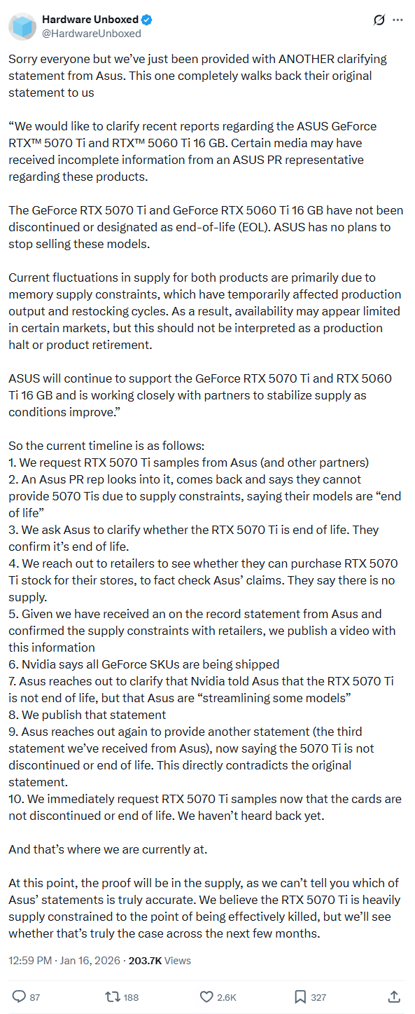 就在我们即将刊发这份报告之际,华硕发布了一则补充声明,证实了我们信源此前的说法:该公司代表此前传递的信息存在偏差,其在国际消费电子展(CES)期间向媒体提及的多款 RTX 50 系列显卡,均未被列入停产清单。声明全文如下: