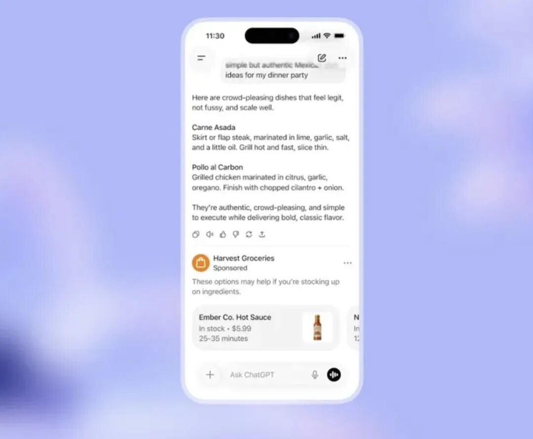 测试阶段,广告不会生硬植入回答文本,而是以底部“对话节点”的形式呈现,且仅在模型判定其与用户当前需求高度匹配时才会触发。比如,当用户咨询墨西哥风味晚餐的烹饪方案,ChatGPT在给出详尽菜谱后,会在页面底部附上赞助商的食材一键选购提示。
