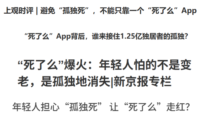 在这股热潮中,媒体也起到了很大的作用,他们把死了么App与“独居安全”、“孤独死”等社会现象挂钩,使其超越工具层面,成为公共话题。