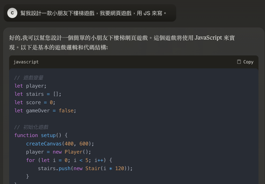 Claude Cowork仍然算是体量较大的软件,制作功能单一的简单程序,或者啥小游戏,对于Claude来说更是手到擒来,上分如喝汤。你只需要一句话提出需求,比如说,“帮我弄设计一款下楼梯游戏”,然后描述你要运行游戏的环境和所需的编程语言,Claude就会在几分钟内输出完整的代码。