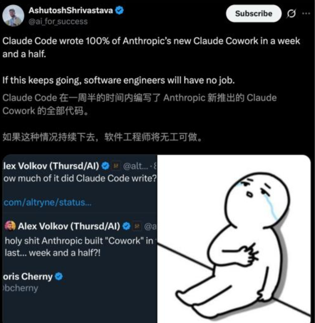 看到Claude Cowork受欢迎,Anthropic得意地宣布,这款协作软件是Claude 大模型自己制作的,10天时间交付,人工智能负责写完100%代码。