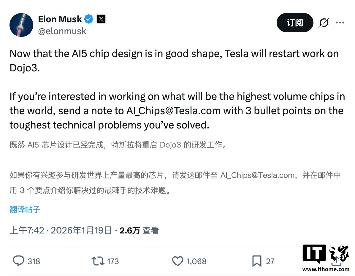IT之家 1 月 19 日消息,今天早间,马斯克在 X 平台发文宣布,随着 AI5 芯片设计完成,特斯拉将重启超级计算机项目 Dojo 3 的开发工作。