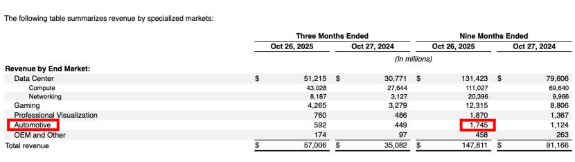分析财报数据来看,2026财年前三季度,英伟达累计1478亿美元的收入里,来自汽车业务的只有17.45亿美元,占比刚过1%,而它将近九成的收入,都来自数据中心那些用于AI训练和云计算的芯片。