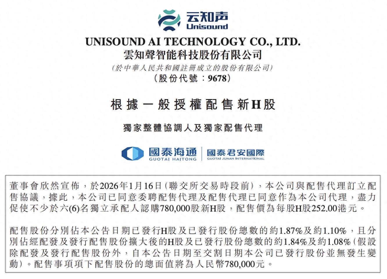 1月16日,港股AI产品及AI解决方案公司云知声在港交所公告,公司于2026年1月16日与配售代理订立配售协议,将尽力促使不少于六名独立承配人认购78万股新H股,配售价为每股H股252港元。