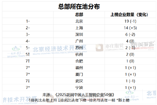 从总部所在地来看,北京以19家上榜企业领先,其中包括寒武纪、月之暗面和云知声等知名企业;上海有14家上榜企业,比去年增加5家,以沐曦、商汤为代表;深圳上榜6家,云天励飞、奥比中光和晶泰科技等企业榜上有名;广州有4家上榜企业,以小马智行、文远知行和云从科技为代表。