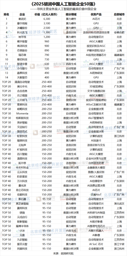 《2025胡润中国人工智能企业50强》完整榜单: