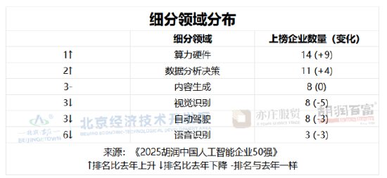 从细分领域来看,算力硬件类企业上榜14家,比去年增加9家,寒武纪是其中的佼佼者;数据分析决策类企业有11家,比去年增加4家,晶泰科技是其中的代表;内容生成类、视觉识别类、自动驾驶类各都有8家上榜,稀宇极智、商汤科技、小马智行分别是各自领域领先企业;语音识别类企业有3家,科大讯飞是行业标杆。