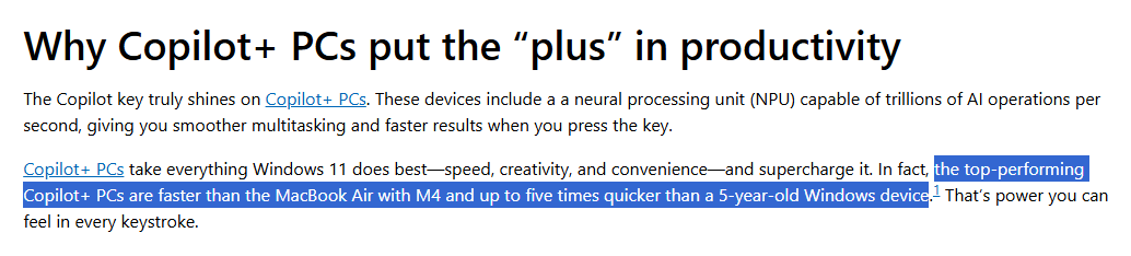 Macobserver 称,微软将 Copilot+ 电脑定位为一次重大的技术飞跃。但该公司的诸多性能宣称,要么是与老旧硬件对比得出,要么是基准测试的透明度严重不足。不可否认,Copilot+ 电脑确实是速度更快、能效更高的设备。但所谓“Plus”版本的优势,听起来往往更像是一种营销噱头,而非一个定义清晰、可量化的产品品类。
