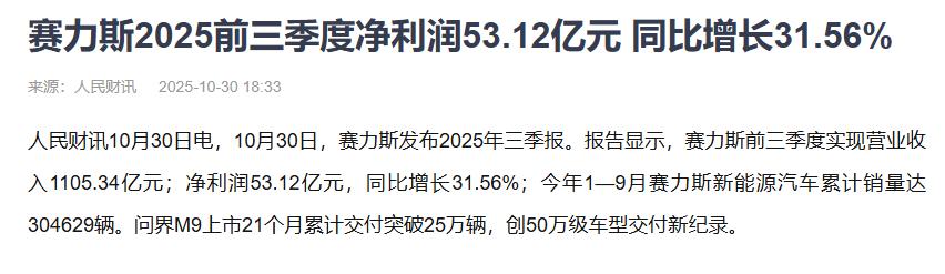 赛力斯的成功,我们不能光靠它支付巨额学费,还要看它得到了什么。从利润上来讲,赛力斯也是不亏的。采购费确实很高,但赛力斯的利润也相当高。2024年,赛力斯实现净利润59.46亿。2025年,前三季度,赛力斯净利润就突破53亿了,全年预计能赚83到100亿。