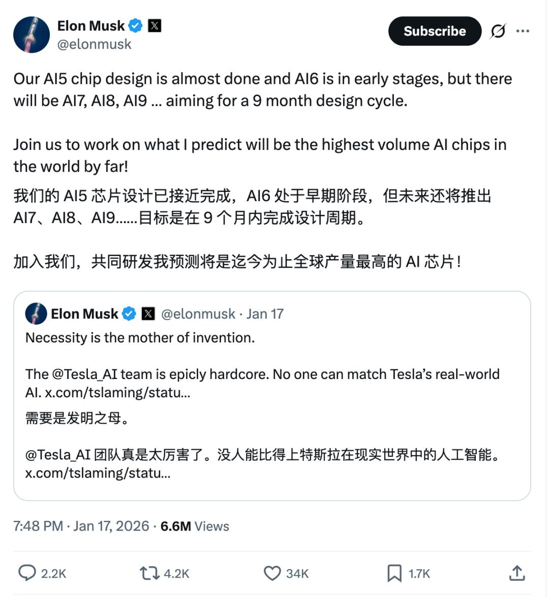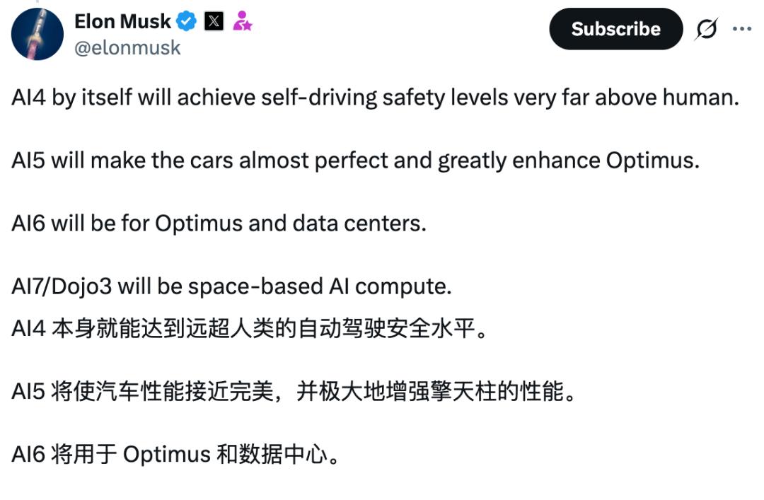 马斯克剧透3代芯片:AI5研发顺利,太空部署Dojo,“迭代周期9个月”