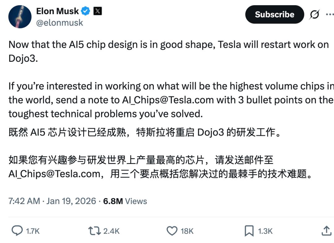 那为什么现在重启了?马斯克给出了两个原因,一方面是因为AI5研发比较顺利,马斯克赶紧在线BOSS直聘。