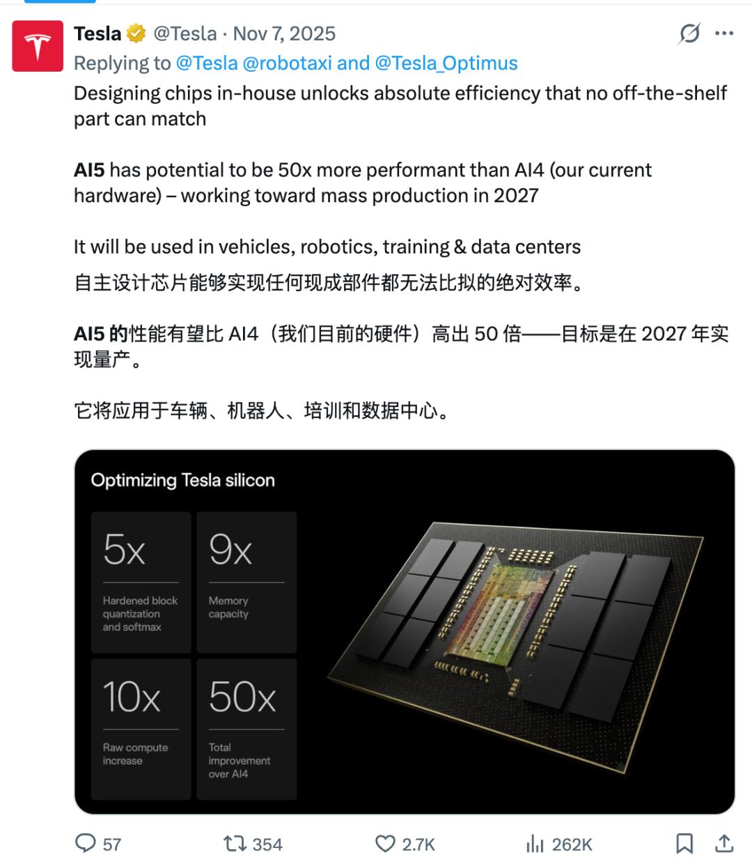 那为啥这一代改名了?可能跟性能提升有关。AI5由于同时找了三星和台积电代工,因此制程存在2nm3nm两个版本。更先进的制程释放更强大的性能,特斯拉官方曾预测,AI5的性能有望比AI4高50倍,目标明年量产。