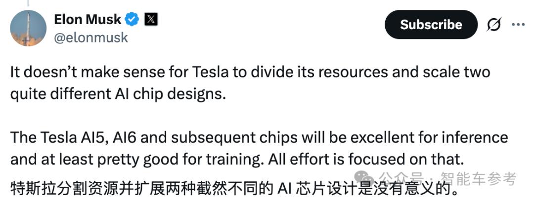 大家应该也知道,其实特斯拉曾经自研了一款Dojo系列芯片,专门用于云端训练,HW系列部署在车端。不过就在去年8月马斯克本人亲自证实,特斯拉解散了Dojo团队,因为“分散资源设计两款不同的芯片没有意义”