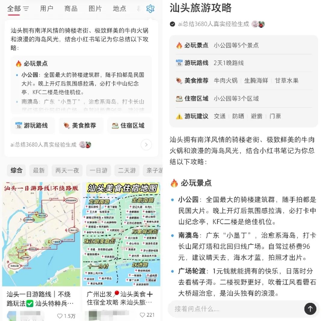 用户获取信息的习惯正在改变。在小红书等社区搜索旅游攻略或消费决策时,AI将能自动整合分散的笔记,生成结构化的方案。这也意味着对于单一内容创作者来说,需要及时调整策略:情绪 化的长文价值下降, 结构清晰、信息密度高的数据点更易被AI抓取和引用 ,如何提升GEO(生成引擎优化)将会成为新的流量密码。