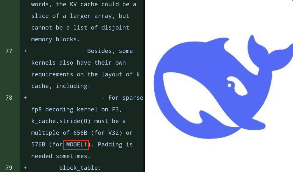 该标识符与已知的现有模型“V32”(即 DeepSeek-V3.2)被并列或区别提及。根据代码上下文分析,“MODEL1”很可能代表一个不同于现有架构的新模型。