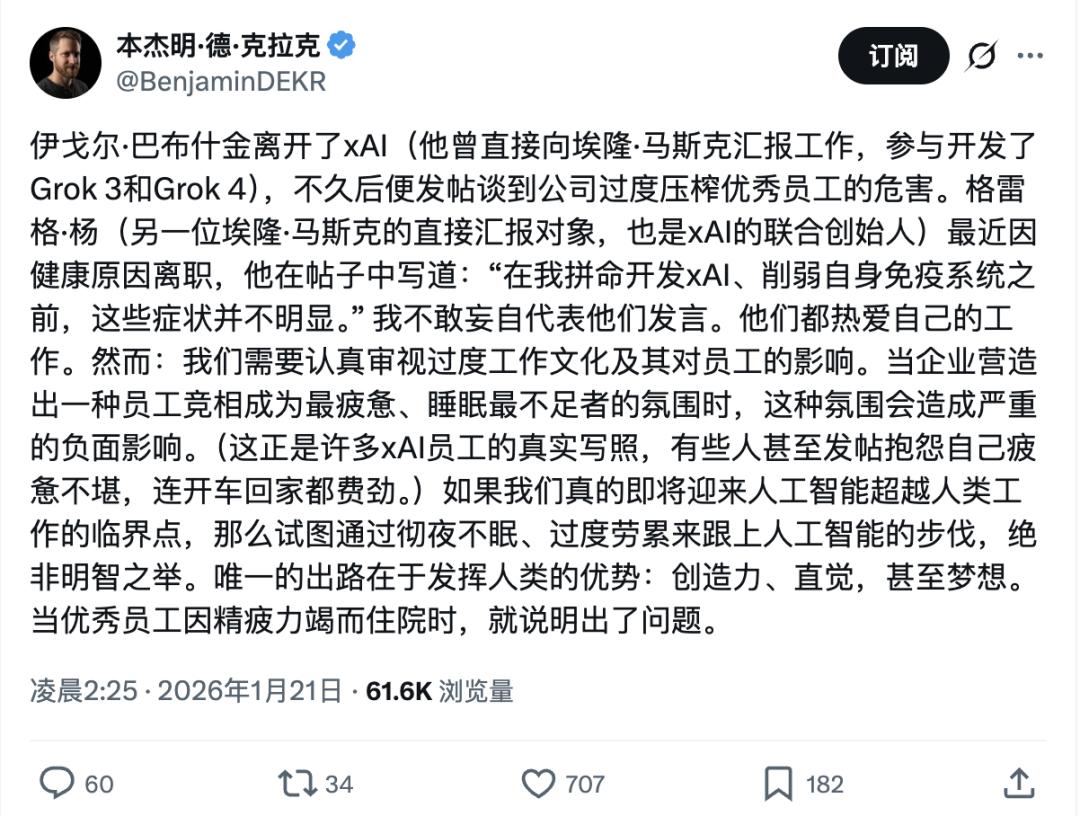 一位网友表示:杨格的离职揭示了xAI过度工作文化的危害,呼吁重新审视员工健康与工作强度的平衡。
