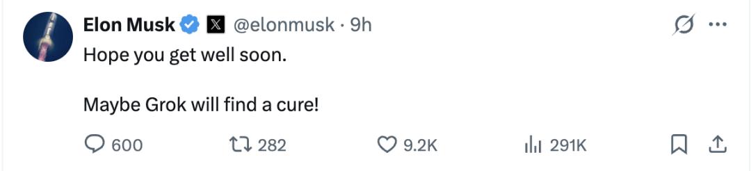 推文发布后,老板马斯克也第一时间留言慰问,祝他早日康复,并顺手cue了一下Grok: