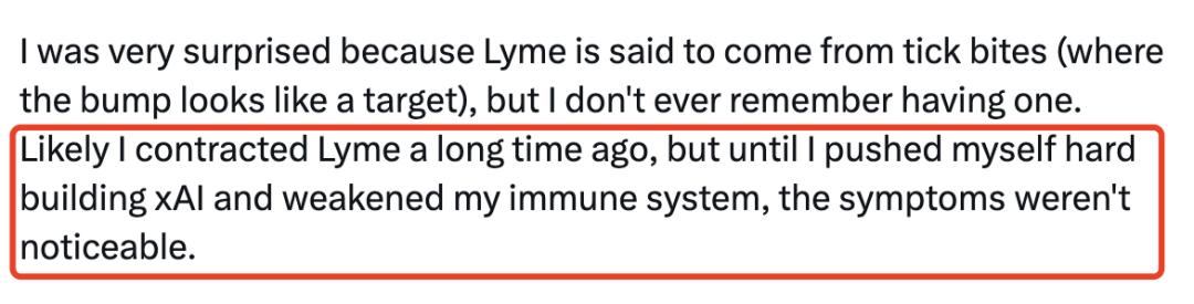 杨格推测,自己可能早年已被感染,但直到高强度投入xAI创立工作、免疫系统被透支后,症状才真正显现。