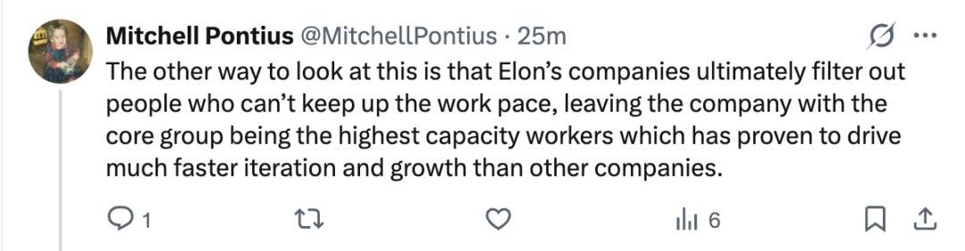马斯克的公司最终会筛选出那些无法跟上工作节奏的人,留下的核心团队则是那些工作能力最强的成员,这种做法已被证明能够推动比其他公司更快的迭代和增长。