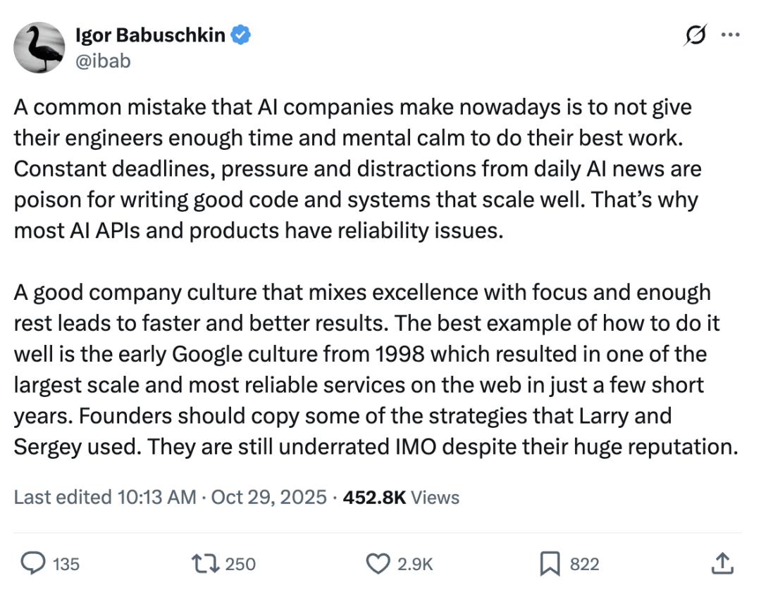 许多AI公司未能给工程师足够的时间和心态去做出最好的工作,导致代码和系统不可靠。良好的公司文化,注重卓越、专注和足够休息,能带来更好的成果。早期Google就是这种文化的典范,创始人们应该借鉴他们的策略。