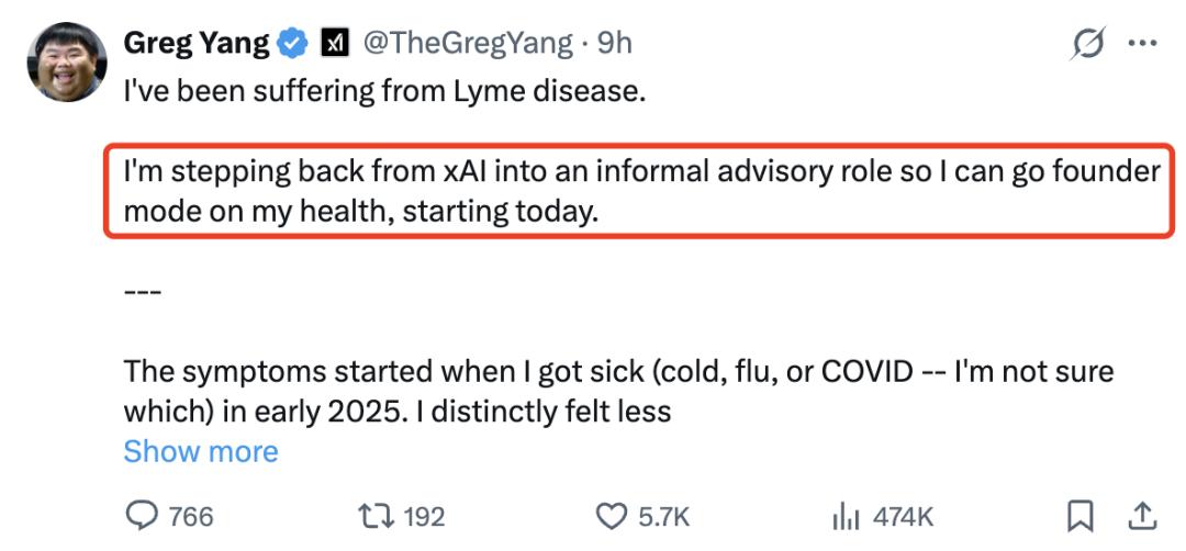 在宣布离开xAI的推文中,杨格透露自己已确诊莱姆病(Lyme disease),将离职xAI,专注于恢复健康。