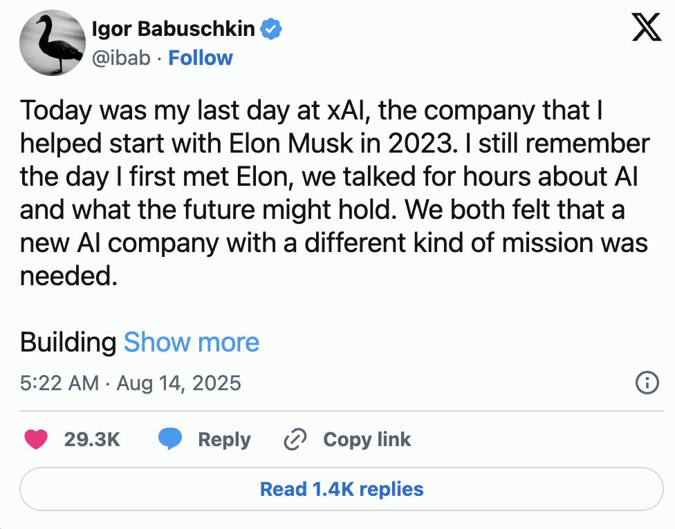比如联创Igor Babuschkin,就在去年8月离开了xAI。