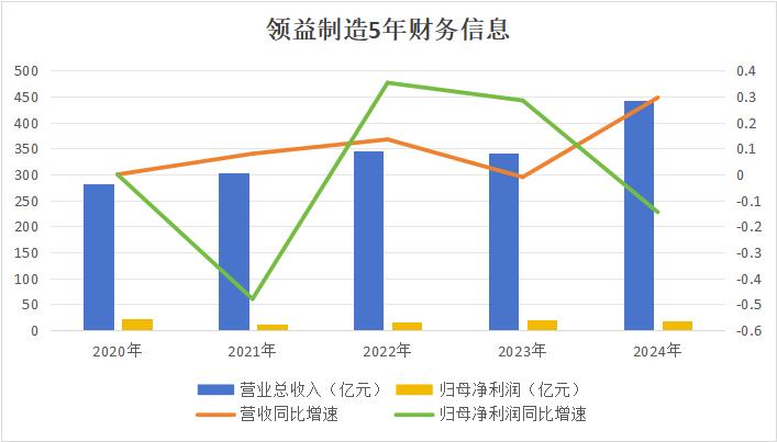 从财务数据来看,近五年,公司营业总收入从281.43亿元稳步增长至442.11亿元,2024实现29.6%的增长。然而,归母净利润相对有所波动,从2020年的22.66亿元峰值大幅下滑,2024年回落14.5%至17.53亿元,呈现出一定程度的“增收不增利”。