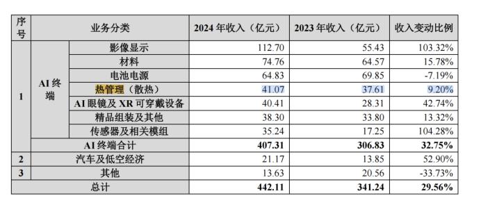 前文提到,在2024年报中,领益智造改了往年“消费电子”的业务名称,加入了“AI 终端”业务,其中就包括热管、均热板等散热零部件、空冷散热模组、水冷模组等产品。年报提到“AI 终端的电子器件的散热管理越来越重要”,2024年,领益智造热管理业务营收为41.07亿,同比增长9.2%。