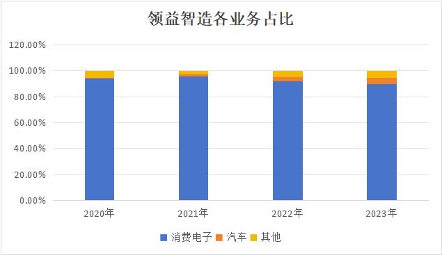 其核心的消费电子业务占比从94.07%逐年下降至89.60%,虽仍占绝对主导,但依赖度降低。同时,汽车业务表现出强劲增长,占比从0.65%快速提升至4.97%,已成为重要的新增长点。其他业务占比则相对稳定,在3.01%至5.43%之间小幅波动。整体来看,公司正从依赖消费电子,向消费电子、汽车等多元业务驱动稳步转型。