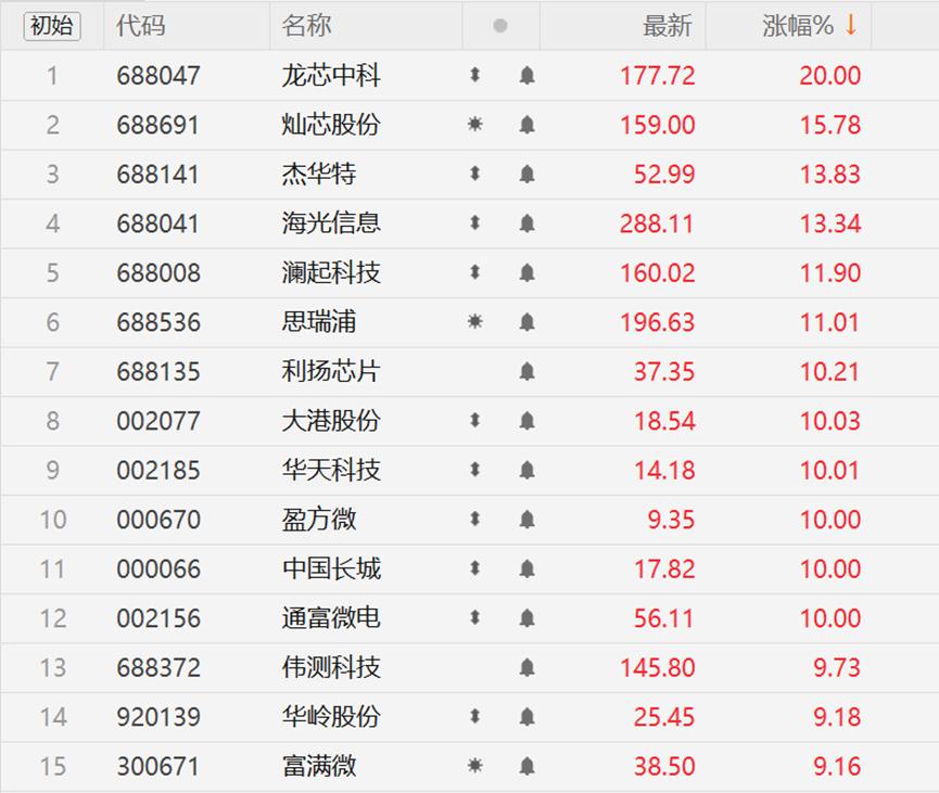 今日A股半导体板块全线飙升,多股股价创区间新高。算力芯片、尤其是CPU概念股涨幅居前,其中龙芯中科20CM涨停,海光信息涨超13%创历史新高,中国长城涨停,澜起科技等跟涨。