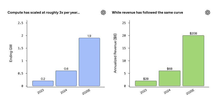 数据显示,OpenAI的算力投入与商业回报之间呈现出近乎完美线性的关系,这种高度耦合的增长曲线表明,AI产业仍处于典型的供给侧约束阶段。现在需求上限仅受制于算力的可用性。如果今天有更多的算力,OpenAI就能推出更多的产品,训练更多的模型。