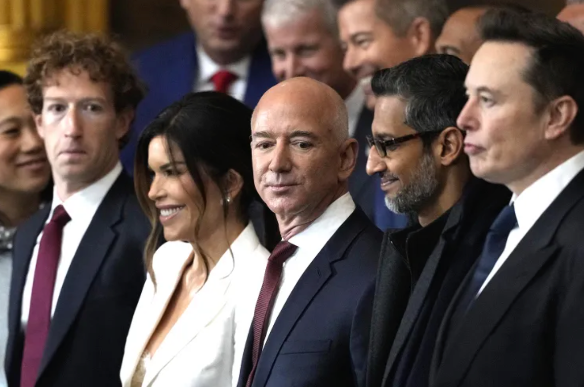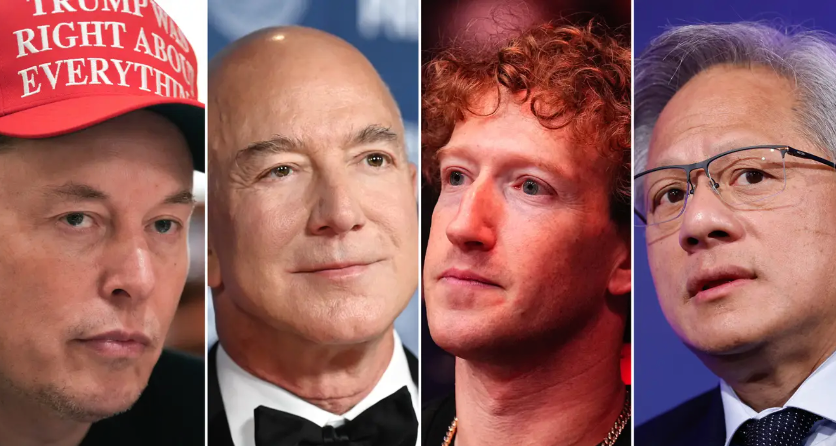 埃隆·马斯克(Elon Musk)、马克·扎克伯格(Mark Zuckerberg)、杰夫·贝佐斯(Jeff Bezos)与黄仁勋(Jensen Huang)都位列彭博全球500富豪榜榜上,他们都曾通过出席就职典礼或捐款表示对特朗普政府的支持。除了这四位,其他对特朗普表示支持的科技大佬还包括蒂姆·库克(Tim Cook)、萨姆·奥特曼(Sam Altman)、桑达尔·皮查伊(Sundar Pichai)、萨提亚·纳德拉(Satya Nadella)和周受资(Shou Zi Chew)。