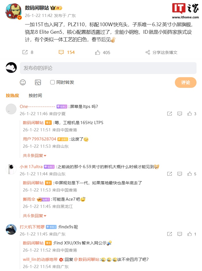 IT之家 1 月 22 日消息,博主 @数码闲聊站 今日发文透露,一加 15T 手机也已入网,标配 100W 快充头,是子系唯一 6.32 英寸小屏旗舰。