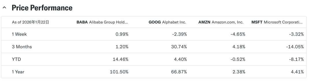 事实上,阿里巴巴在过去一年的股价表现,要远远好于谷歌、亚马逊和微软。近三个月表现不佳,一定程度反映出市场对其闪购业务投入的担忧。