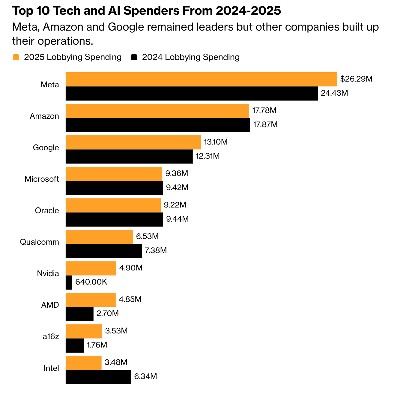 根据彭博社对公开披露信息的梳理,英伟达、OpenAI、Meta等公司的政府关系部门在2025年进行了扩张和重塑,以更好地与特朗普的政策议程保持一致。总体而言,2025年,美国大型科技与AI公司在游说上总计花费了1.09亿美元,首次突破1亿美元大关,同时还在首都华盛顿的游说队伍中增加了与特朗普关系友好的说客。